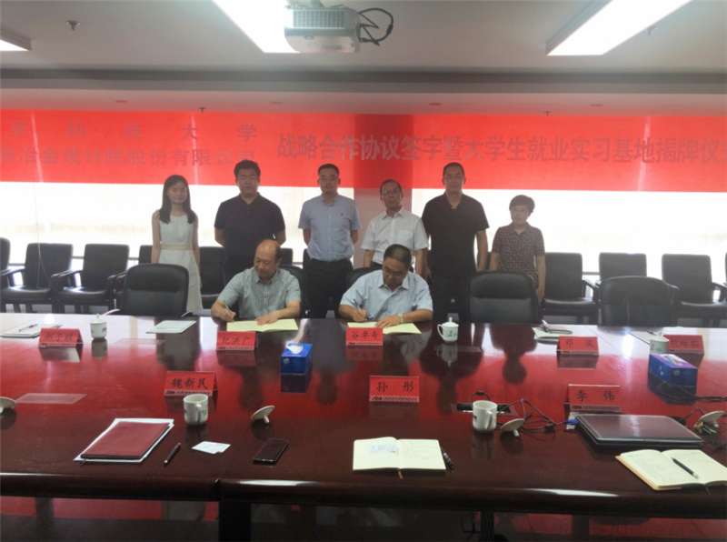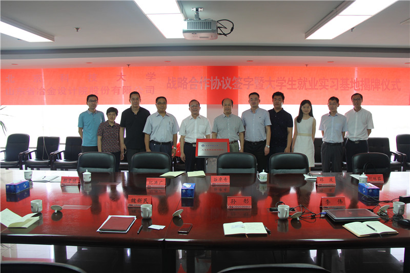 2019年7月23日,山冶設計與北京科技大學戰略合作框架協議簽字儀式暨北京科技大學大學生就業實習基地揭牌儀式在濟南舉行。北京科技大學土木與資源工程學院黨委書記紀洪廣,黨委副書記鄧波一行4人,公司董事長魏新民,黨委書記谷卓奇,副總經理孫彤及相關科室人員出席了簽字儀式。