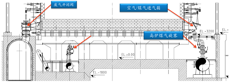 廢氣開閉器及煙道布置在焦爐焦側(cè),混合煤氣及空氣導入裝置布置在焦爐機側(cè),便于調(diào)節(jié)從機側(cè)到焦側(cè)各立火道煤氣流和空氣流,且便于廢氣流的排出,有利于焦爐長向加熱的均勻性。